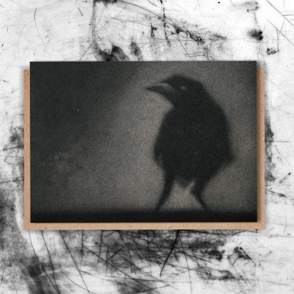 Crow standing in a darkened room (card)